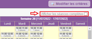Il vous est possible de voir les séances des activités déjà complètes en cliquant sur la case à cocher adéquate, ceci afin d'être sûr que l'atelier est bien présent mais déjà plein (voir ci-dessous).